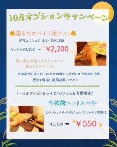 ハワイアンフォレストSpa名古屋黒川店では10月のオプションキャンペーンとして下記のオプションを特別な価格でご提供いたします☆