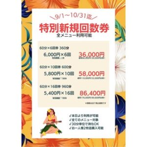 初めてご来店のお客様限定で新規回数券がよりお得に購入いただけます!