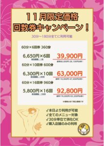 ハワイアンフォレストSpa名古屋黒川店では11月・12月・1月それぞれの月ごとに回数券キャンペーンを実施します☆
